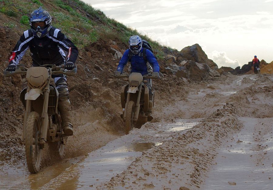 Es kann auch wie 2022 an beiden Tagen ganz heftig regnen - die Gelände werden dann durchweicht und deswegen für den einen oder anderen eher schwierig zu fahren sein. Es macht natürlich Sinn bei solchen Verhältnissen gröbere Reifen auf den Enduros zu haben. Diese gibt es auch für Reiseenduros in verschiedenen Ausführungen - Straßenreifen können im Schlamm nicht funktionieren wie auf trockener Straße.