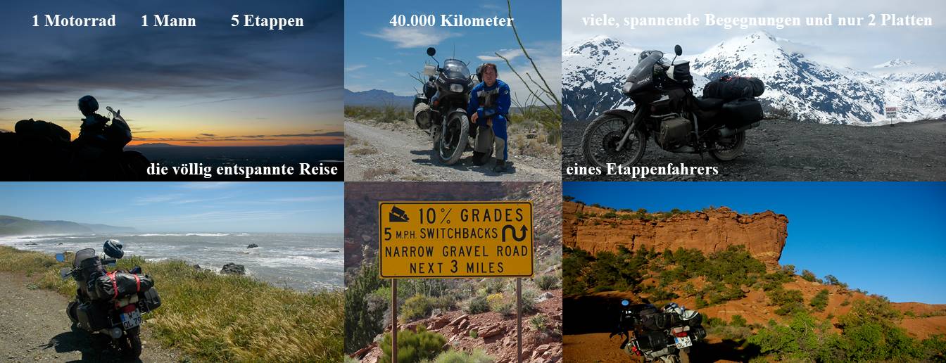 Bestückt mit einer Portion Mut, einer gesunden Naivität und einem Satz neuer Reifen hat sich Jochen Stiebel im Jahr 2010 mit seiner treuen Honda Transalp PD10 auf eine Reise gemacht, die immer noch nicht abgeschlossen ist. Die ihn aber bislang in mehreren Etappen fast einmal rum um die Vereinigten Staaten von Amerika gebracht hat - natürlich mit einigen spannenden Abstechern in das fantastische Kanada.